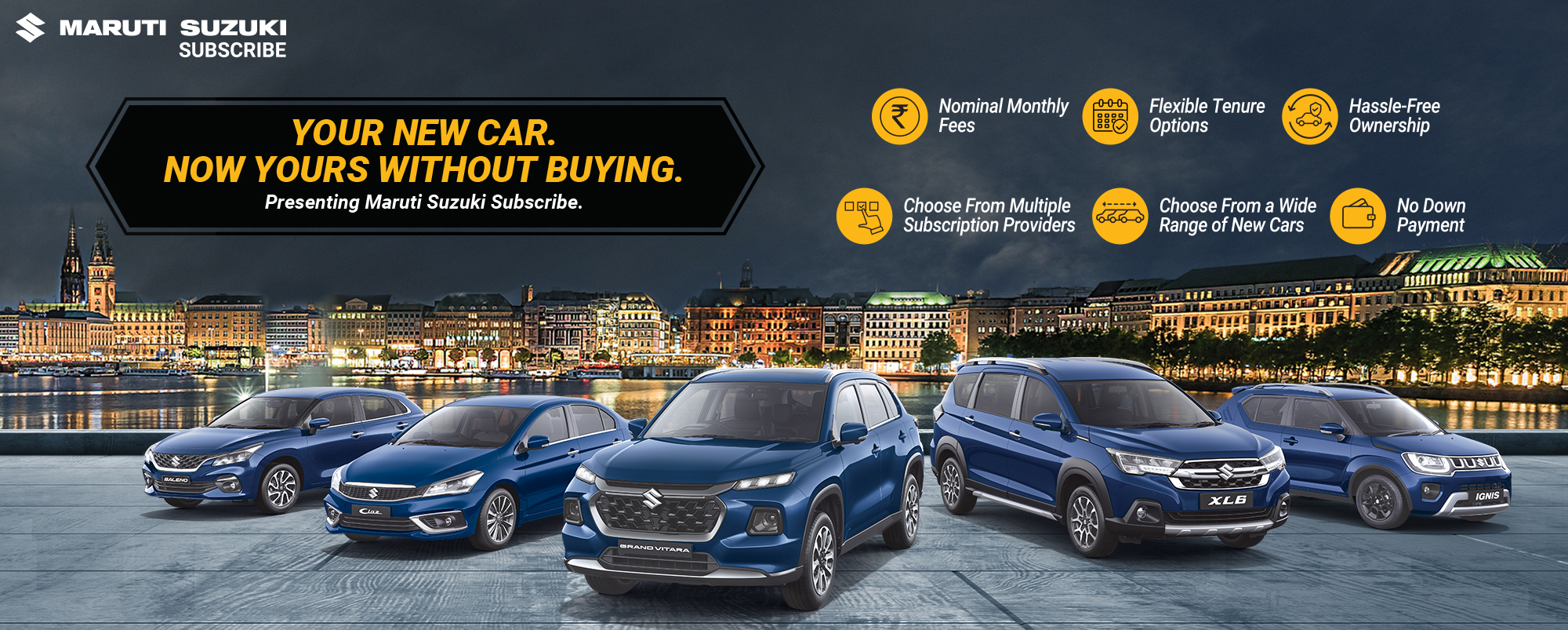 Maruti Suzuki Subscribe enables all customers to enjoy driving their preferred Maruti Suzuki cars without having to deal with all the financial responsibilities that come with owning a car.All you need to do is opt for a monthly subscription plan at a fixed monthly fee, which includes the routine maintenance and insurance costs, and choose a flexible tenure. At Nainital Motors Pvt. Ltd. in, Rampur Road, Haldwani, all Hatchback, Sedan, SUV, the MUV models line-up includes Baleno, Invicto, EVitara, Jimny, Ciaz, Ignis, Fronx, Grand Vitara, XL6. Here, you will enjoy Maruti Suzuki Subscribe benefits such as: